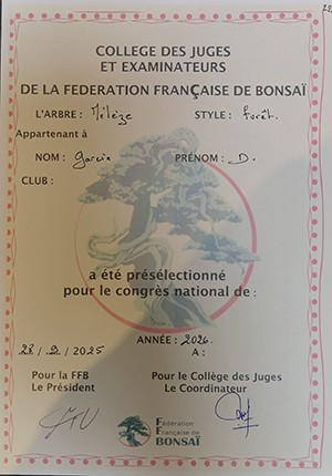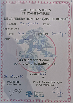 Dominique G., qui exposait son Acer palmatum "kiyohime", a eu la grande satisfaction de le voir sélectionné pour l'exposition nationale de la FFB qui se tiendra en 2024. Un grand bravo à lui ! ![]() ![]() |