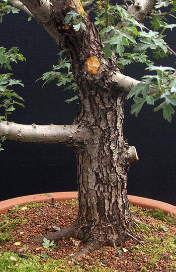 Lorsqu'on taille des branches de bonsaïs à feuilles caduques à cicatrisation rapide, il est courant de tailler au ras du tronc, en creusant très légèrement la plaie.
