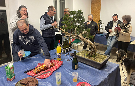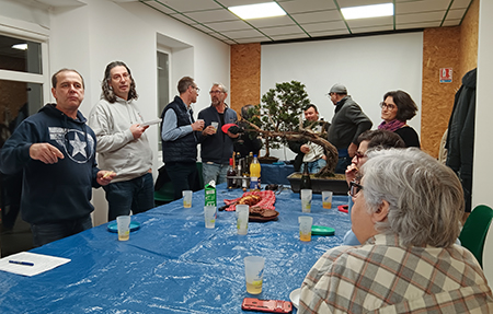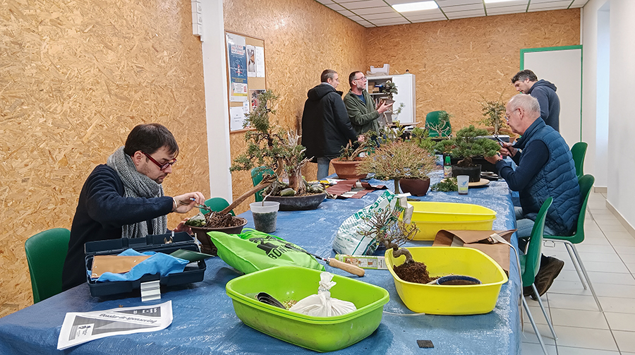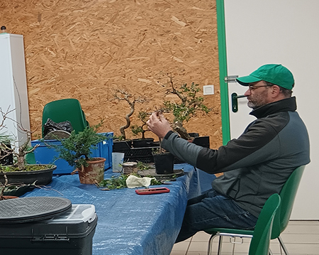 ![]() Le Bonsaï Club Blésois est assez bien représenté, avec 6 membres le matin, 4 l'après-midi dont 3 sont restés pour le déjeuner (avec la bonne surprise d'un dessert réalisé par Cédric : un savoureux Paris-Brest au praliné) . Quelques achats d'arbres (buis, metasequoia et charme), de pots et de shitakusa : nous ne sommes pas venus pour rien ! L'après-midi, Gilles Juigné, président des "Amis du Bonsaï" de Changé près du Mans et formateur régional, anime l'atelier, très instructif, axé sur le choix de la face et des branches. La démonstration est faite à partir d'un Acer palmatum triple tronc, appartenant à une adhérente du Literati, et d'un Carpinus appartenant à notre ami Cédric. La démarche est très pédagogique et Gilles, suivi par un auditoire attentif, donne des explications très claires pour justifier pourquoi il faut couper telle branche, garder telle autre, pourquoi il faut réduire la hauteur de l'arbre et partir sur une branchette plus basse pour recréer une cime etc... ![]() Une très bonne journée ! Ci-dessous le Carpinus de Cédric AVANT-APRES (avec des coupes à reprendre avec une grosse pince) ![]() |