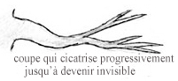 celle-ci. La coupe doit être perpendiculaire à la branche : c'est une fois que les rameaux qu'on aura sélectionnés se seront développés, qu'on pourra creuser la coupe et la travailler pour qu'elle se referme.